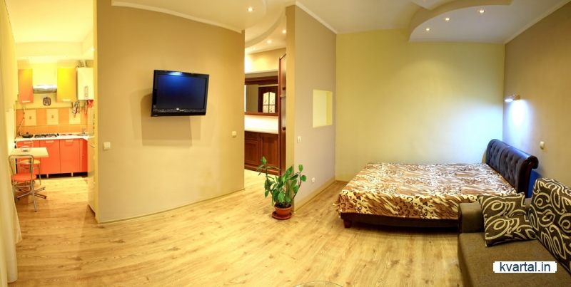 В квартире современный ремонт 2011 года, комната совмещена с кухней и представляет собой уютную современную студию. В квартире автономное отопление, двуспальная кровать в ортопедическим матрацем, двуспальный удобный мягкий раскладывающийся диван, стеклянный журнальный столик, на стене ЖК- телевизор. Су совмещен с большой угловой ванной. Квартира оснащена кондиционером, стиральной машинкой-автоматом, Wi-Fi-Интернет. На полу – ламинат, на окнах стеклопакеты. Небольшой застекленный балкончик с видом на бухту. Полностью закрытый двор, парковка во дворе.