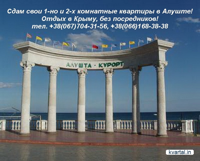 Сдаю квартиры 1-но и 2-х ком квартиры в Алуште, от хозяина! ! ! Находятся на ул. Октябрьская, до МОРЯ 1-но 10-12 мин пешком, 2-х ком 8-10 мин пешком через парк! Квартиры с современной мебелью, полностью укомплектованными кухнями, холодильниками и кондиционерами в каждой комнате, телевизор с каб тв, после ремонта 2013 года! Возле дома магазины и детские площадки, недалеко 2-а супермаркета. По желанию, возможна встреча на авто. Тел. +380677043156, +38(066) 1683838